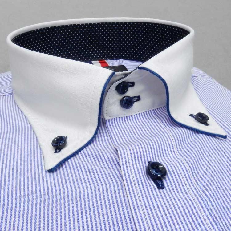 長袖ワイシャツ 白×青紺 ストライプ ドゥエ ボタンダウン クレリック PARIS-16e 形態安定 M-3L HKP-ZC