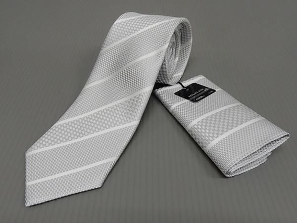 西陣織 フォーマルネクタイ チーフ付◇銀×白◇市松縞◆シルク100%◇日本製◆礼装◆結婚式・披露宴 njc14