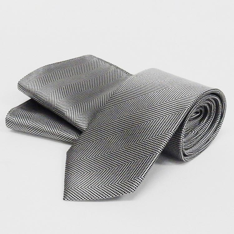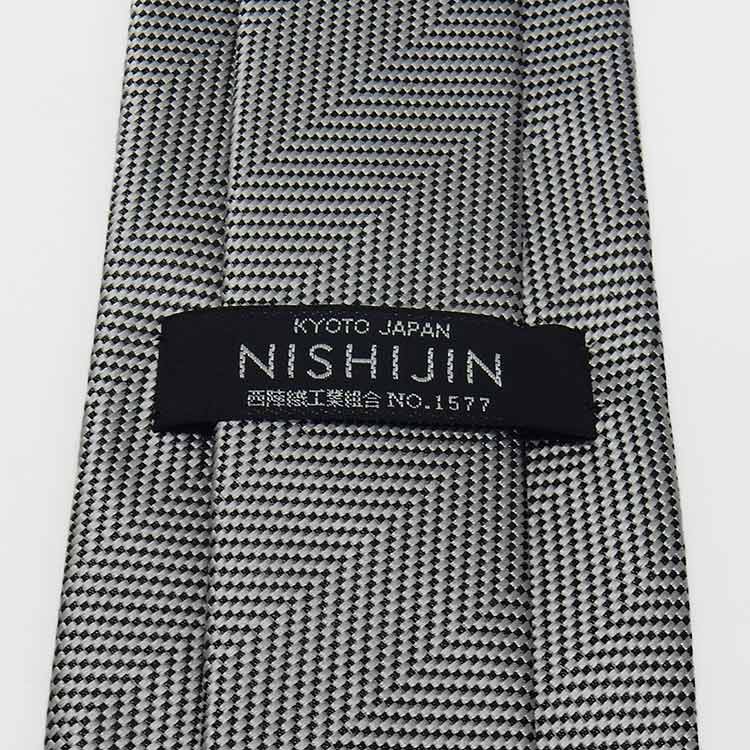 西陣織 ネクタイ チーフ付 シルバーグレー×黒 ヘリンボーン風 シルク100% 日本製 メール便送料無料 NJ-CHB02