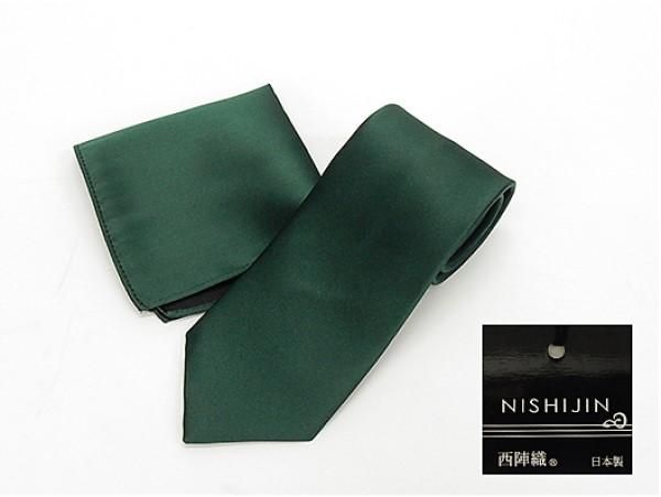 西陣織 ネクタイ チーフ付 深緑 無地 朱子織 シルク100% 日本製 ソリッドタイ メール便のみ njz09