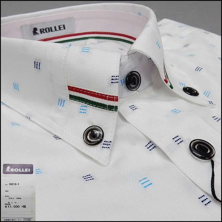 | 色・柄・特徴 | 白地×濃紺×青 ドビー格子柄×刺子織り 随所にイタリア国旗モチーフ装飾 ボタンダウン 衿裏:別生地 ボタン:デザインボタン 左ボタン付き胸ポケット |